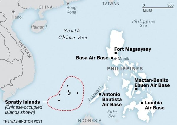 《华盛顿邮报》制作的地图中显示美军可进入的菲律宾5个军事基地部分距离南沙群岛(红色虚线部分)距离非常近