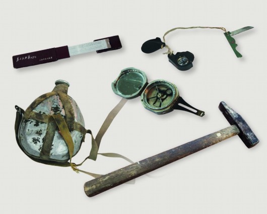 在野外工作时用过的地质锤、罗盘、放大镜、小刀、计算尺、水壶