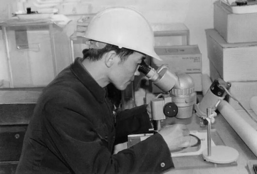 1983年春节,在“勘探二号”钻井平台上用显微镜观察从海底取出的岩芯磨制的薄片