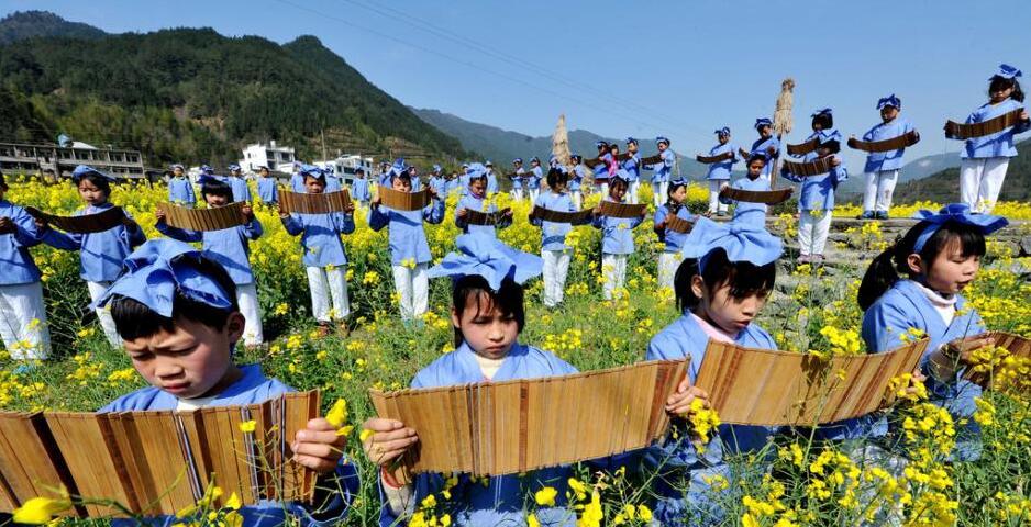 2016年3月25日,江西省上饶市,当天,江西省婺源县溪头龙尾小学4年级的近50名学童身穿古装,在老师的指导下走出校园,来到中国四大花海之一的该县江岭万亩梯田油菜花海中,开展“穿古装、诵国学”活动,让同学们感触传统文化魅力、弘扬经典文学的同时,使我国传统文化与自然得到有机结合,呈现出人花相融、天人合一的美丽景象。
