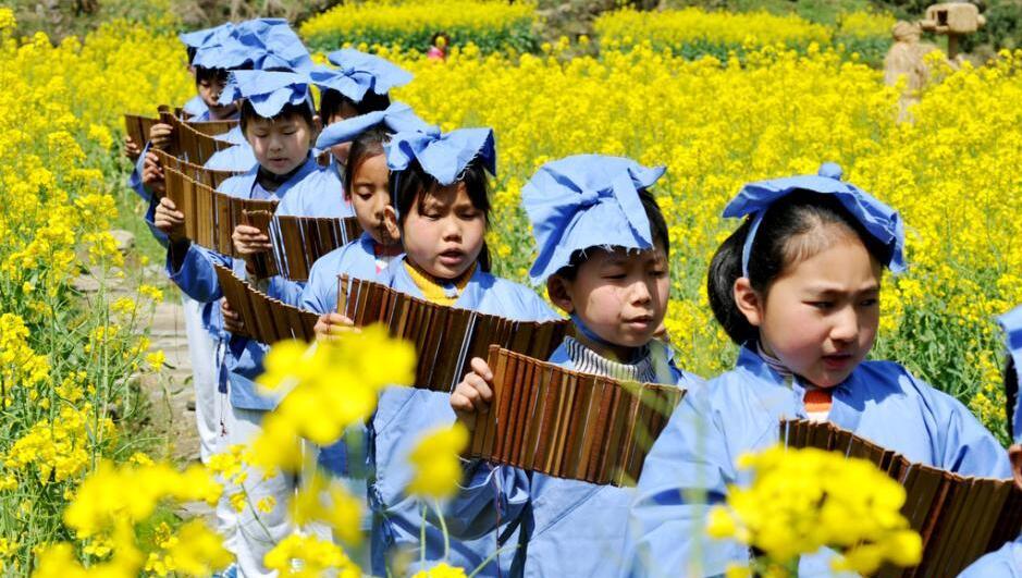 2016年3月25日,江西省上饶市,当天,江西省婺源县溪头龙尾小学4年级的近50名学童身穿古装,在老师的指导下走出校园,来到中国四大花海之一的该县江岭万亩梯田油菜花海中,开展“穿古装、诵国学”活动,让同学们感触传统文化魅力、弘扬经典文学的同时,使我国传统文化与自然得到有机结合,呈现出人花相融、天人合一的美丽景象。