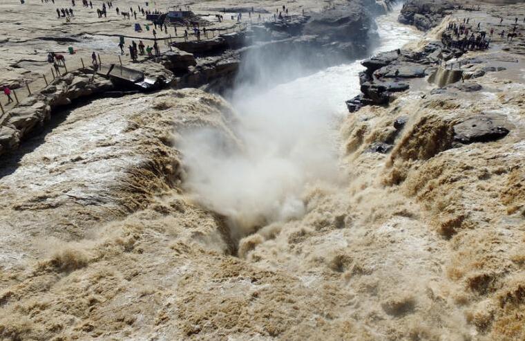 2016年3月26日,山西临汾,受气温回暖和上游融冰开河影响,位于山西吉县和陕西宜川县交界的黄河壶口瀑布迎来一年一度的 “桃花汛”。壶口瀑布水量骤增,每秒流量达到2200立方米,形成壮美瀑布群,吸引了众多游客。 “桃花汛”是指每年三月下旬到四月上旬,黄河内蒙古段冰凌消融形成春汛。当其流至下游时,由于恰逢沿岸山桃花盛开,故被称为“桃花汛”。
