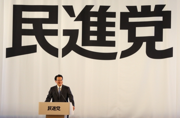 3月27日,在日本首都东京,新成立的日本“民进党”首任代表冈田克也在结党大会上发表讲话。
