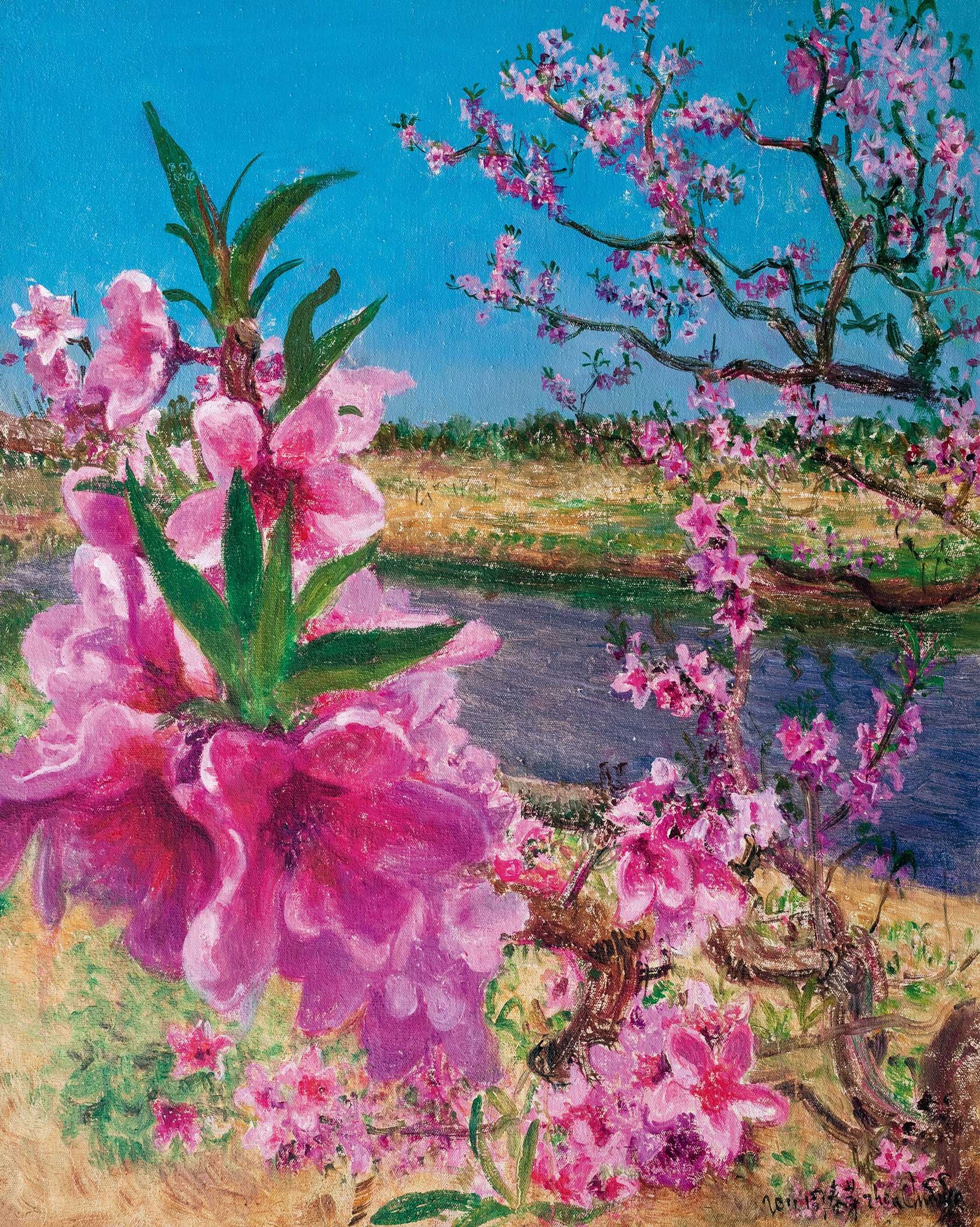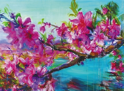 周春芽2006年作品《桃花风景系列2006——湖上艳色》。