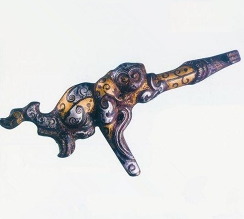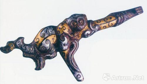 猴形铜带钩,长12.56厘米、宽3.88厘米、厚1.52厘米、高2.09厘米。正面通体作浮雕母猴形象,攀援动作,姿态灵巧。猴体跪伏,左臂向前上伸高举,看去明显长于右臂,屈爪弯回巧妙形成钩首,似单臂挂于树上,右臂向身后弯曲持尾。猴子缩首侧目,圆脸短毛,高鼻隆额,下颌突出,尖嘴紧闭,深目鼓 睛,双耳侧立。昂胸伏身,上体裸露,巨乳高耸,似戴叶状胸罩。下身着有短裙,上缘外翻,并以斜线为饰,下缘则以较大花朵为饰,翘臀撅尾,动感十足。右腿前屈踢至胸侧,左腿屈膝跪卧向后,爪尖触及尾根。长尾弧曲接近环形,尖部及腕,握于右爪。正面通体鎏金,光泽耀眼。背部素面,没有鎏金,露出绿、褐铜锈,设有圆形钮。此件猴形带钩,具有典型的战国风格,其以动物灵猴为饰,构思巧妙,造型生动,机敏可爱,灵动有神,保存完好,金光璀璨。