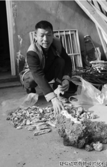 “以前我也听人说过,我们这里出土过动物化石”,车光响说,当地人称这些为“龙骨”。随后车光响继续在原地寻找,又发现了一块比较大的化石,和一些疑似动物牙齿的化石?!按蟮幕ぜ甘迕?,宽度有十多厘米?!倍莱莼?,呈圆弧状排列,镶嵌在泥土中,牙齿露在泥土以外的部分长约3厘米,牙齿最粗的地方直径约1厘米,此外还有几十块大小不一的骨化石碎片,“从骨头和牙齿的大小来看,这个动物的体型应该比较庞大”。