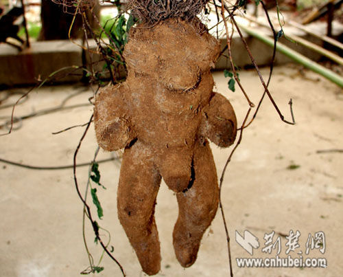 邹先生以前种过山药,他解开该植物的藤子后,一眼就认出“这不是何首乌,是山药。这个人形山药应该是把几个小的山药,切割后栽到模子里,然后把它整体固定,长出来就是这个样子,山药的藤也是嫁接的?!彼婧蟊收咔肜葱⒉毓簿中顺桥沙鏊晃淮邮陆滞菲终炱乒ぷ鞯拿窬?,他看了该植物后说:“这个应该是假的,这种东西全国各地都发现过,已经证实了是人工栽培的,之前在孝昌也发现过有人售卖这种“人形何首乌”,最后都被鉴定是假的。