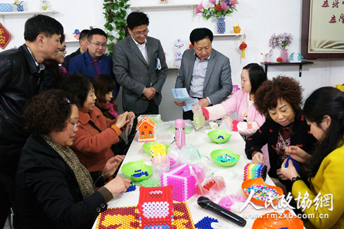 3月29日,四川省德阳市政协组织委员对群团组织“招善引慈”公益项目开展为期一周的视察调研,对扶贫济困、帮老助幼中的实际问题提出建议。图为委员们视察雒城镇柳州路社区“爱心串珠”项目。 王俊 摄