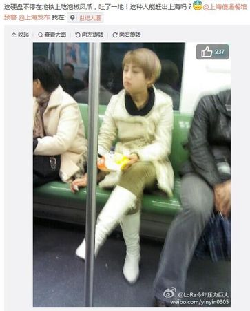 而后被网友扒出,原来早在2013年3月就有网友在微博上爆料,一女子在地铁上吃泡椒凤爪,而且随地吐碎骨。从截图来看两者疑似为同一人。