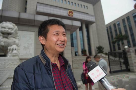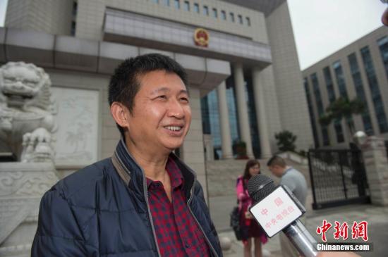 3月30日上午,海南省高级人民法院就陈满申请国家赔偿案举行公开听证。 图为陈满在海南省高级人民法院大门外接受媒体记者采访。中新社记者 骆云飞 摄