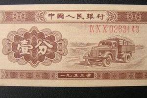 刚才提到,因为81版是后补的, 因此53年版本的1分钱存存世量比较少,也被认为是更之前。1953年印制的53版一分纸币,票面正面下方印有的发行日期为1953年,右上角有罗马数字和阿拉伯数字的标识。一般,罗马数字都是有三位的,而阿拉伯数字则有七位。在数字下面,是一个大卡车的图案。目前,53年一分的存实来那个非常稀少,非常珍贵。这枚一分纸币值多少钱?市场价格大概是在一百元到一百五十元左右。另外,如果能集齐一套,包括一分、两分、五分的话,这套钱币就更加之前了。整体能售出两千元左右。