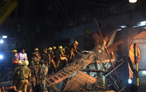 3月31日,救援人员在印度加尔各答的立交桥坍塌现场切割桥体寻找被埋者。