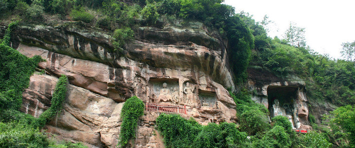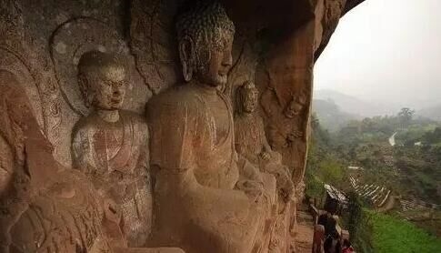 令人遗憾的是,在石刻上还是可以见到一些“到此一游”的涂鸦。最早的涂鸦人可追溯到宋代,在一尊佛像底部,可以看到“乾德三年九月思安僧俗游此”??脊抛医樯?,从落款年号和文字内容来判断,有可能是宋代游客。在摩崖造像中,“一佛二菩萨”、“一佛二弟子”、“千手千眼观音”随处可见,佛像造型丰满,比例匀称。