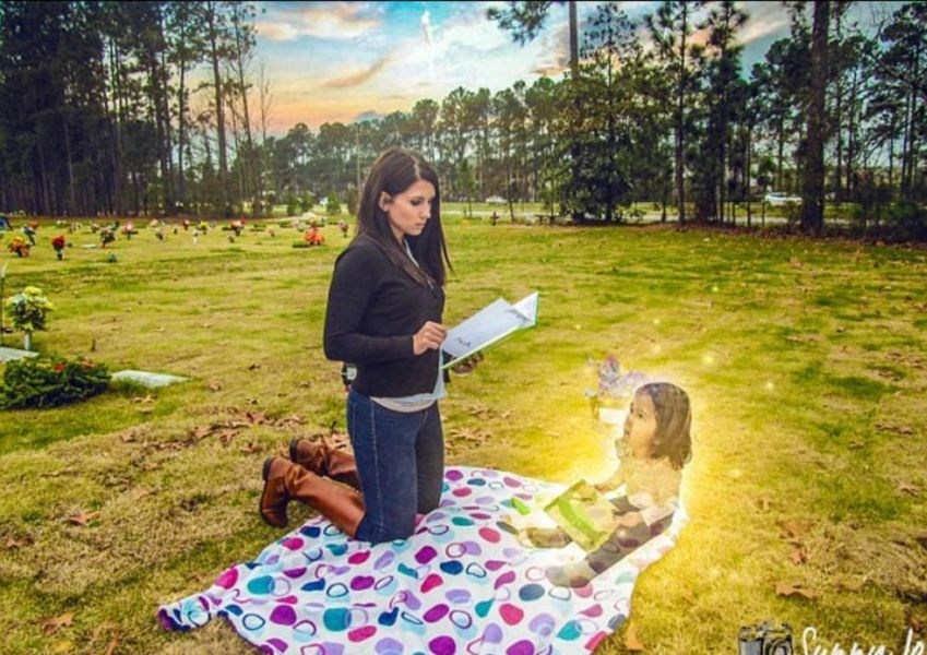 女儿去世后不久,Ditty即与摄影师取得联系,她告诉后者自己的女儿在吃香蕉时不小心被噎死,希望他能够帮助自己拍摄一组合照悼念死去的女儿。摄影师被Ditty感动,随即答应了她的请求,且不收取任何费用。Sunny Jo表示,这位母亲对拍照的要求非常精细而且明确,她详细地向摄影师描述自己想要表达的场景,希望后者能够实现。图为Jeanie Ditty正在给女儿读她最喜欢的故事书,图片上的小姑娘就像一位天使在安静的聆听。