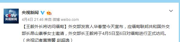 【环球网综合报道】据央视新闻4月4日消息,外交部发言人华春莹4日宣布,应缅甸联邦共和国外交部长昂山素季女士邀请,外交部长王毅将于4月5日至6日对缅甸进行正式访问。