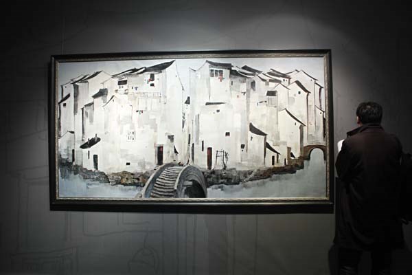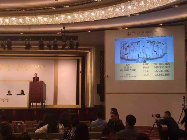 [这幅油画卖了2.36亿港元!]今晚7点,吴冠中《周庄》油画以1.3亿元起拍,经多伦竞价,最终2.36亿港元成交,刷新中国油画拍卖纪录。此作画于 1997年,尺寸为148x297cm,画面以黑、白、灰三种颜色为主,在点、线、面的形式元素组成中,不仅看得到江南的小家碧玉,更看得到江南人的大 气,是艺术市场上目前所见最大尺幅的吴冠中佳构。拍前便备受关注,为该专场中的重中之重。(易小燕)