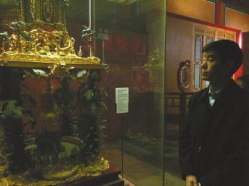王津凝望自己参与修复的铜镀金雄鸡动物座楼阁式钟。曾洁摄