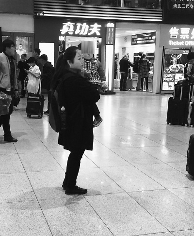 北京南站到达口,一名黑衣女子怀中抱着一个两三岁的孩子。她盯着出站口的旅客,拿块苹果塞进孩子嘴里。