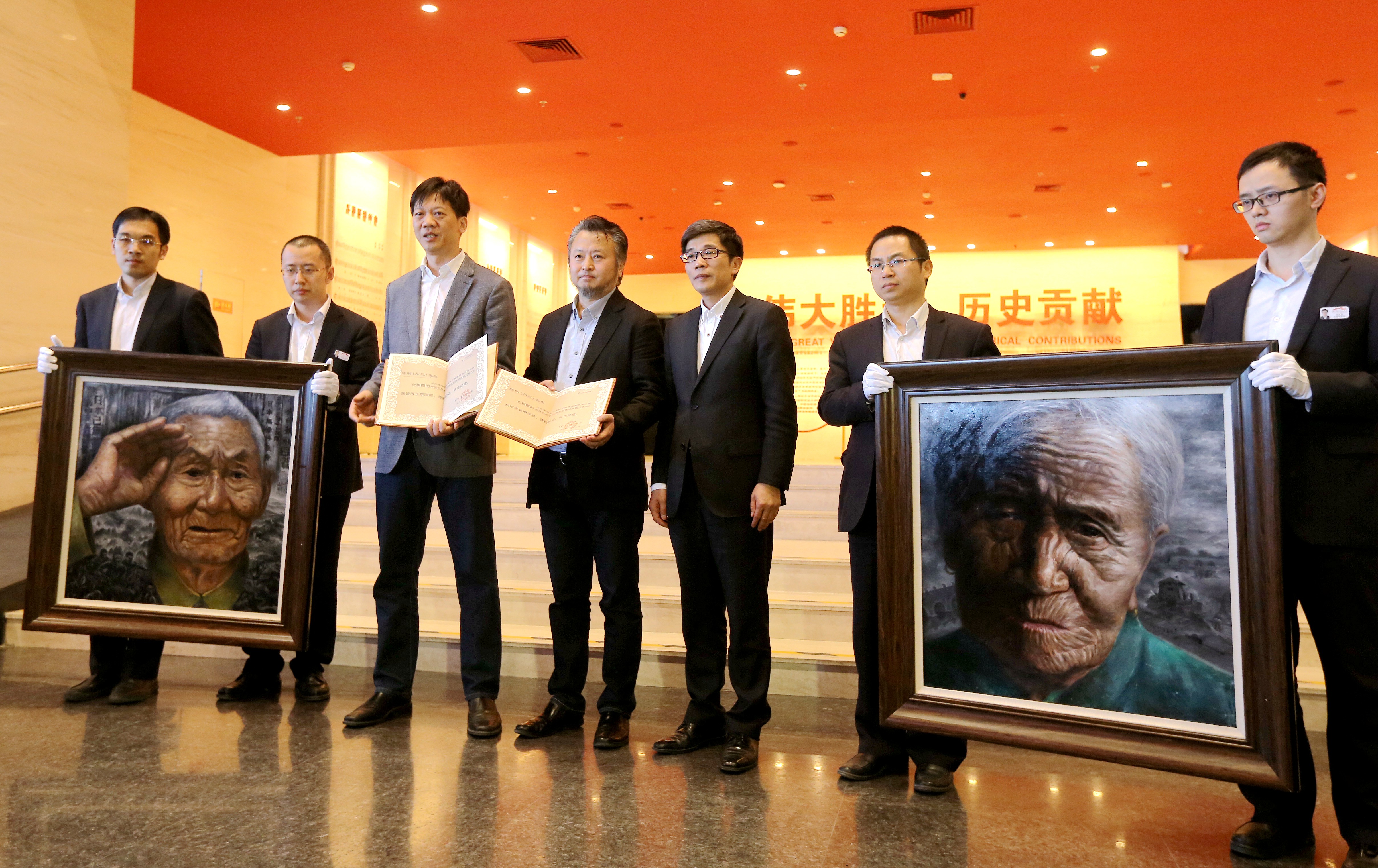 4月1日,“清明节的铭记———忆抗战英烈传抗战精神”主题教育系列活动在中国人民抗日战争纪念馆开幕。图为民革党员陈明向抗战馆捐赠油画《往事》、《敬礼》。记者 贾宁摄