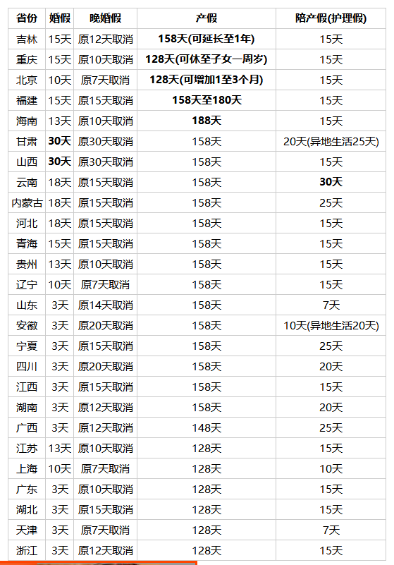 基本假期128天至188天不等 最长可休至子女一周岁