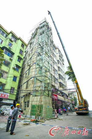 昨日下午,记者来到现场,看到村里主干道已围起警戒线,拆除工作正在紧张进行中。一辆城管执法车和一辆长臂吊车已进驻现场,7层高的电梯四周也搭建好了密密麻麻的竹架。长臂吊车正在该路段作业,将玻璃一点点拆卸下来。