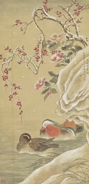 此幅《雪里鸳鸯》为陈氏工笔花鸟的典型之作,整幅画面工整雅致,背景中穿插着几株俏丽的梅花、秀气绽放的山茶,树枝、石块上的积雪,还有飘洒下的雪花,有一丝“梅雪都清绝”的意趣。山茶、梅花下,一对鸳鸯结伴相游于岸边,静谧和谐,于飘雪的冬日中透出淡淡的春意。表现技法上在传统的画院工笔技法基础上结合日本绘画温婉柔丽的特点,在清新典雅与明净柔和之中寻到独属于陈之佛的花鸟韵味。