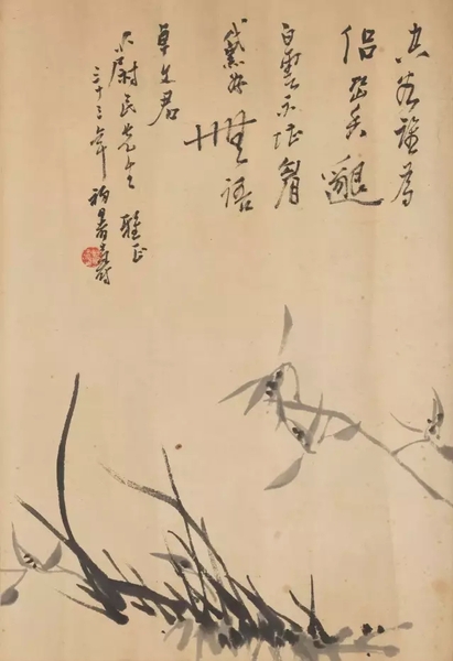 “幽兰生前庭,含熏待清风。”兰花恬淡素雅,高傲孤洁,一向为文人所爱?;锌钍裘窆辏?944),其时正是潘天寿绘画的风格形成之期?;欣蓟蒌烊魅笮悖鼓榷嘧?。挺拔的笔势与纵逸的情意,表现出兰花清逸出尘的独特气质?;猩峡钊讼粑得裣壬窆保剿叵埠檬榛鹗?,抗战时期萧蔚民调任中央通讯总社采访部主任,与诸多艺专教员相识过从。1944年潘天寿出任国立艺专校长,吴茀之亦至重庆,此作便于当年赠以萧蔚民先生。兰花白莲,多年辗转,三人心情寄语,由此可见一斑。