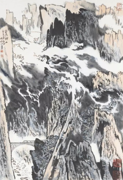陆俨少“爱新就新”,写下了不少反映新社会、新事物的作品,现代化建设亦是主题之一。如中国铁路主要干线之一的成昆铁路即其显例。本幅所写正是列车穿出隧道,跨越悬空横架桥梁上的行驶过程中?;婀雇佳暇?,中有云气如带来练飘绕,益显地势高峭。下方层岩积迭,紧密扣连,无形中强调了开盘铁路工程危阴之钜,布局用心之细致,足见画家倾力而成之。