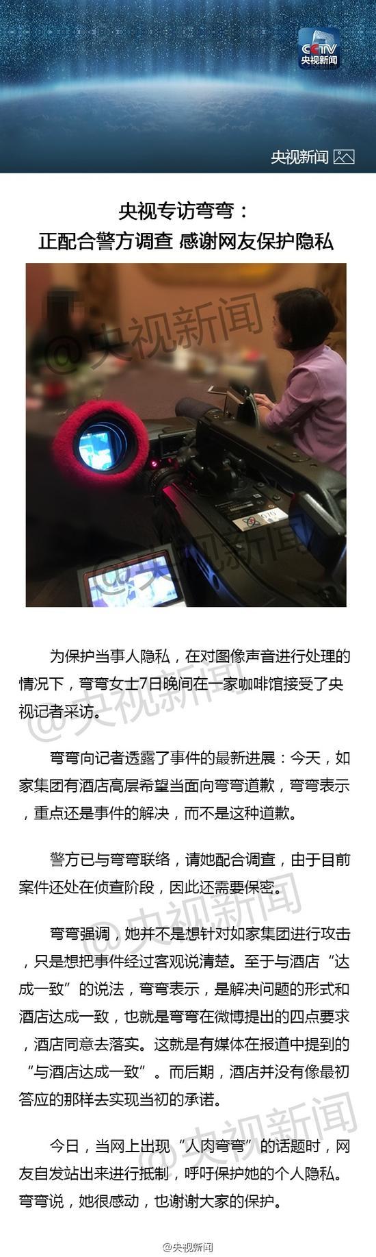 弯弯今晚(7日)接受央视专访,表示接受采访并不是想攻击如家,只想客观说清事件经过。警方已与其联络,请她配合调查。今日网上出现“人肉弯弯”,网友自发抵制,她称感谢大家的?;?。专访视频正在制作,随后将发布。(央视记者赵旭飞)