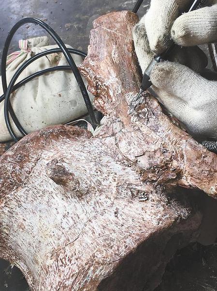 之后,技师们还需要对化石骨架开展第三道工序——加固?!盎鐾烈院?,温度、湿度等环境有所改变,时间长了,有可能会风化?!蓖醺6?,因此他们会使用固体颗粒胶,对化石进行加固,这样才能对抗湿度、温度等外界环境的变化。