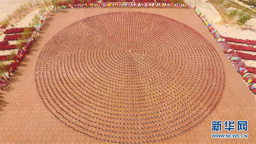 4月7日,在河南登封少林塔沟武术学校练功场,上课间操的学员摆出圆形图案。当日,河南登封少林塔沟武术学校2016年“春训”拉开帷幕,2.6万名学员同上阵,进行队形变换、十八般兵器、少林硬气功、少林集体棍等多种功法演练?!按貉怠笔巧倭炙滴涫跹C磕甏杭究沟囊幌钋炕盗坊疃荚谔嵘г钡哪土途杭甲刺?。新华社发(牛书培 摄)