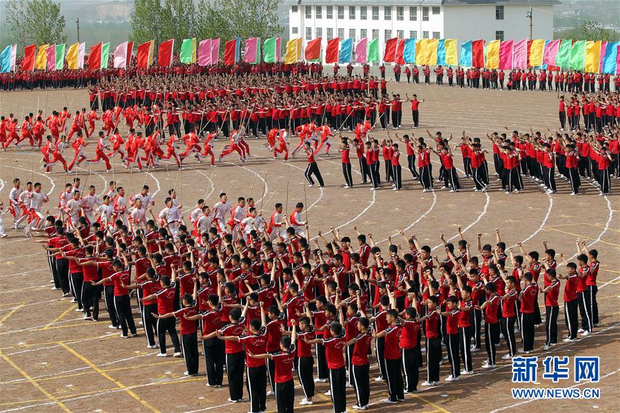 4月7日,在河南登封少林塔沟武术学校练功场,上课间操的学员摆出圆形图案。当日,河南登封少林塔沟武术学校2016年“春训”拉开帷幕,2.6万名学员同上阵,进行队形变换、十八般兵器、少林硬气功、少林集体棍等多种功法演练?!按貉怠笔巧倭炙滴涫跹C磕甏杭究沟囊幌钋炕盗坊疃?,旨在提升学员的耐力和竞技状态。新华社发(牛书培 摄)