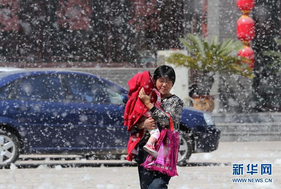 4月9日,山东潍坊市民在漫天飞舞的杨絮中出行。随着气温不断攀升,山东潍坊市区不少栽种杨树的地方开始飘“雪”,漫天飞舞的杨絮给人们出行带来不便。 新华社发(张驰 摄)