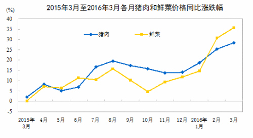 从同比看,3月份CPI同比涨幅与上月相同,部分分类涨幅较高。前期全国低温寒潮影响了鲜菜的生长,与去年3月相比市场供应相对不足,鲜菜价格同比上涨较多,涨幅达35.8%,影响CPI上涨约0.92个百分点。由于前期猪肉价格长时间低迷,养猪场户积极性受挫,导致生猪存栏下降,生猪产能处于近年低位,市场供应偏紧,猪肉价格同比上涨28.4%,影响CPI上涨约0.64个百分点。