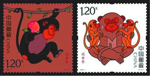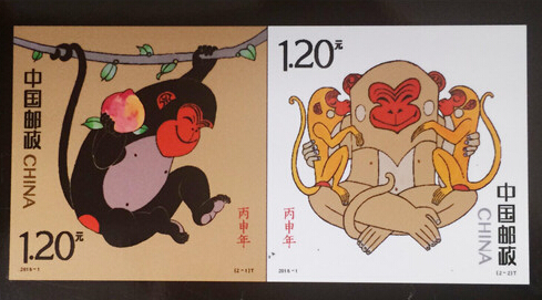 猴年生肖邮票一共包括两枚,图名分别是灵猴献瑞和福寿双至,面值均为1.2元,单张邮票的规格是36*36毫米,齿孔度数为13度,一整张邮票一共包括 16枚,整张邮票的规格大小为168*196毫米,版别为胶雕套印,采用了防伪纸张、防伪油墨、异形齿孔和荧光喷码四种防伪方式,雕刻着为赵川和马荣,责 任编辑为王静,由北京邮票厂印制而成。这两枚邮票的底色分别为彩色和白色的,其中福寿双至邮票的图案为一种猴子正在采摘桃子,灵猴献瑞是一直母猴子抱着两 只小猴子,这两枚邮票有祥猴献寿和家庭幸福美满的寓意。