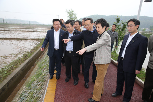 4月10日,民进中央主席严隽琪率民进中央调研组,赴湖南开展“在全面建成小康社会进程中扎实推进农村扶贫供给侧改革”年度专题调研。图为调研组一行来到廖家桥,听取有关负责人对湘莲种植等产业和紫荆河水区改造情况的介绍。