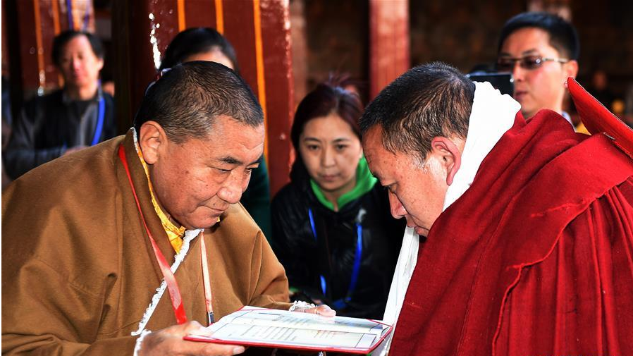 当日,西藏自治区2016年度藏传佛教学经僧人考核晋升格西拉让巴学位立宗暨颁证仪式在拉萨大昭寺大殿举行,来自藏传佛教格鲁派主要寺庙的11名高僧获得格西拉让巴学位。格西拉让巴是藏传佛教格鲁派僧人修学显宗的最高学位。200余名藏传佛教僧众见证了这场立宗答辩仪式。 新华社记者 觉果 摄