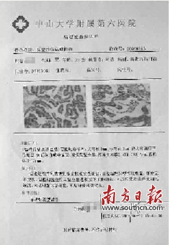 医生迅速与阿明取得了联系,了解情况。阿明说,当天凌晨,他到了中山六院,在门口就被一名穿“白大褂”的“好心人”带到了距离医院10分钟路程的一个小诊所。至于做了什么检查,他也说不清楚。检查后,他拿到了这几份报告,得知自己得了“胃癌”,和家人商量后,他决定收拾行李到珠海治疗,因为有家人在那。在小诊所的检查过程中,他共花了2000多元。