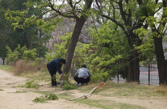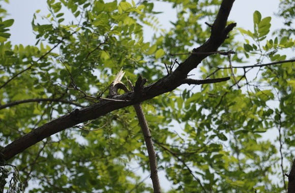 大妈拿着十几米长的自制长柄镰刀,疯狂砍下大段的槐树枝干并随意扔在公园内,带走上面的槐花。