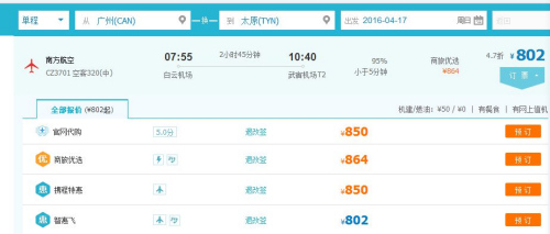 4月12日上午10:30点左右,记者搜索4月17日广州飞太原的航班,选中南航早上起飞的CZ3701航班后,在报价列表中看到,航空公司官网的价格是850元,而智惠飞给出的价格则为802元。