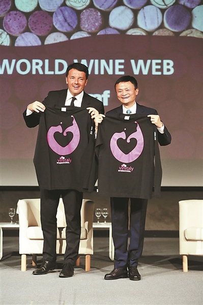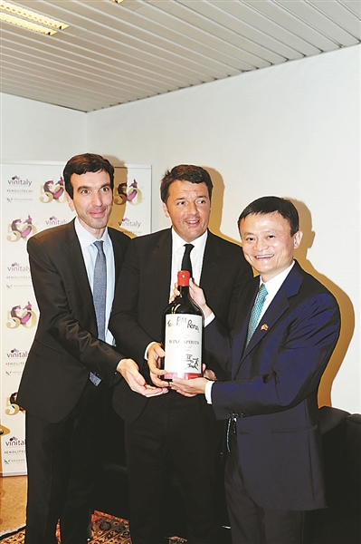北京时间4月11日,阿里巴巴集团董事局主席马云应意大利总理伦齐邀请出席国际顶级葡萄酒展会“Vinitaly”(维罗纳),并首次宣布阿里巴巴将在今年9月9日开启首届“天猫全球酒水节”。展会上,马云将一瓶印有“天猫全球酒水节”标志的全球独家定制葡萄酒送给伦齐作为礼物。伦齐对马可·波罗到访过的城市杭州很感兴趣,也期待阿里巴巴把意大利介绍给中国。