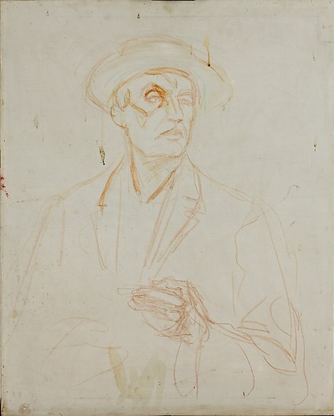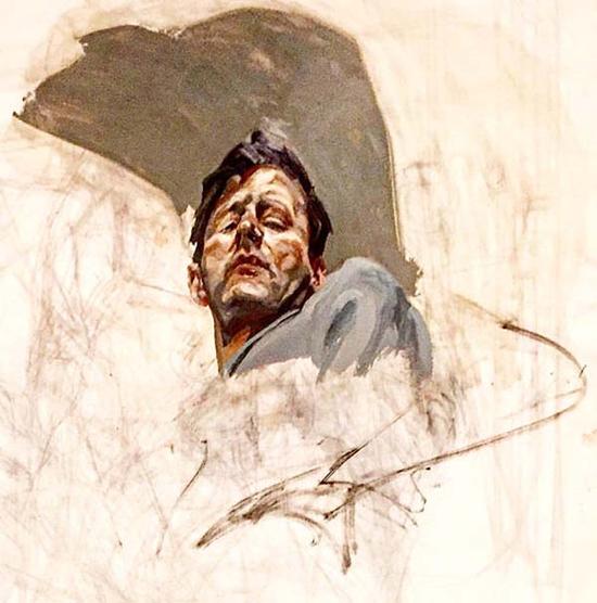 弗洛伊德的《倒影自画像》,画于1965年。在此幅作品中,艺术家只完成了脸部,画布的其他部分依旧只是纷乱的线条。如此一幅半成品却别有一番韵味。