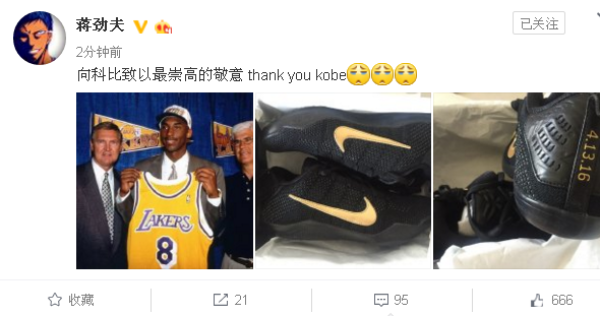 蒋劲夫晒出与陈建州同款的篮球鞋,向科比致敬:“向科比致以最崇高的敬意 thank you kobe”。