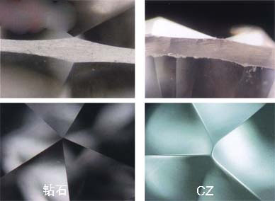 7、 面平棱直点尖锐由于钻石是世界上最硬的物质,因此,抛光钻石刻面之间的棱线平直而尖锐,仿制品硬度小,棱线圆滑且多有磨损。