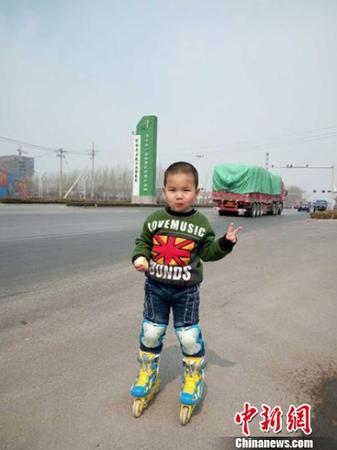 轮滑小子张佳博轮滑路上十分开心。