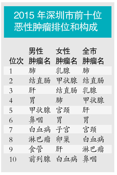 关键词:深圳 男性肺癌居首位 女性乳腺癌第一