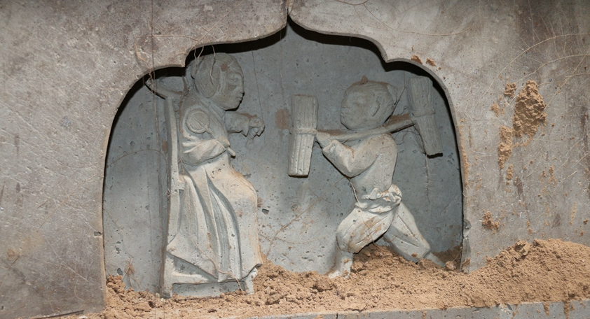 其中,北面墙中间有一处龛室,龛室有高浮雕图像,图像清晰可见。东面墙有龛室两处,一处有砖刻高浮雕图像,人物图像勾勒细腻逼真,由于遭到破坏,无法看清人物着装,另外一处无浮雕,可能遭到破坏。西面墙同东面墙布局一样,有龛室两处,均有高浮雕图像。南边的图像已造到破坏,无法辨别,北边的浮雕图像完整,清晰可见。这些图像都是“二十四孝”故事。
