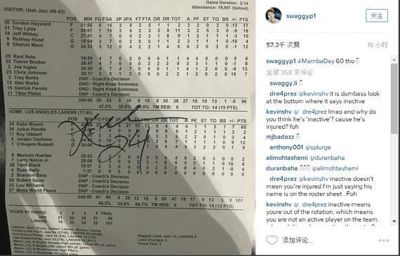 虽然科比没有给尼克-杨的鞋子签名,但是尼克-杨最终还是得到了一样拥有科比签名的纪念物,那就是一张昨天湖人与爵士的赛后技术统计表,科比在那场告别战中砍下60分。得到签名后,尼克-杨还把那张技术统计表晒在自己的IG上。