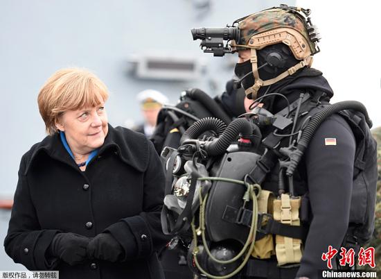 当地时间1月19日,德国总理默克尔访问基尔海军基地,视察并慰问了海军士兵。