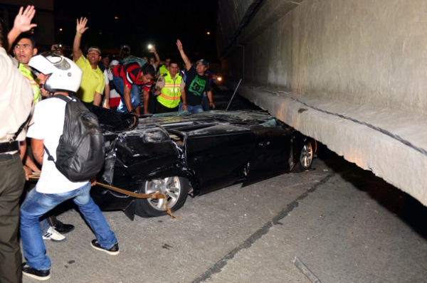 4月16日,在厄瓜多尔第一大城市瓜亚基尔,人们试图救出一名被断桥砸中困在车内的人。